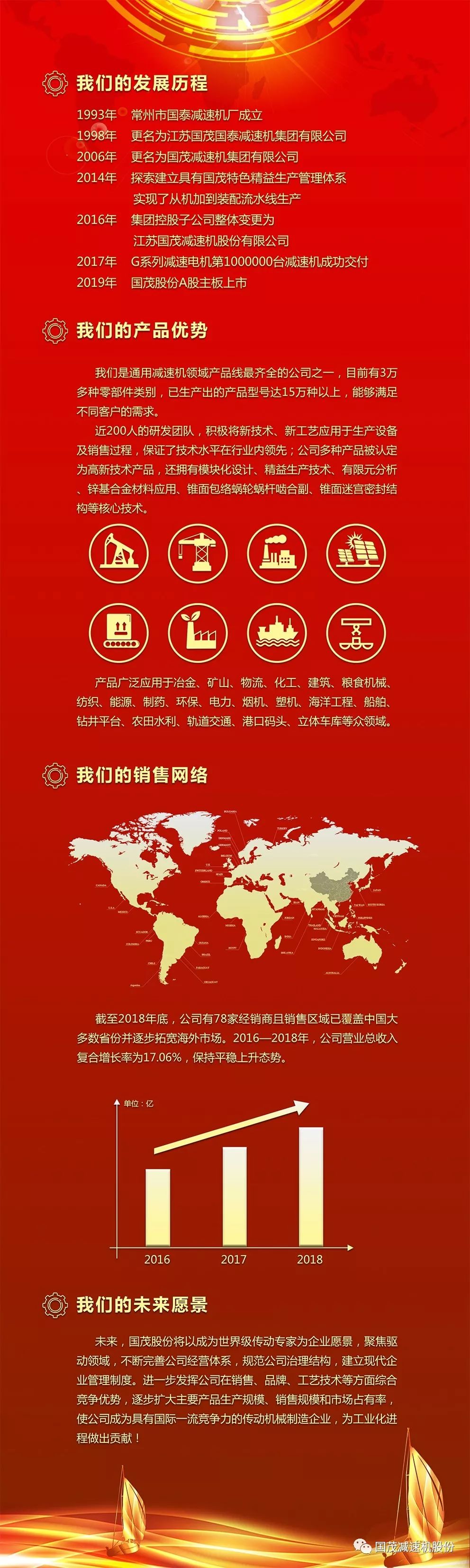 2019年6月14日上午9點30分,江蘇國茂減速機股份有限公司上市儀式于上海證券交易所舉行,宣告江蘇國茂減速機股份有限公司正式上市,股票簡稱為“國茂股份”,股票代碼為“603915”。這是國茂股份一個值得記載的歷史時刻,這也是一個新起點,國茂股份風帆高揚、破冰踏浪,開啟登陸資本市場的新征程!